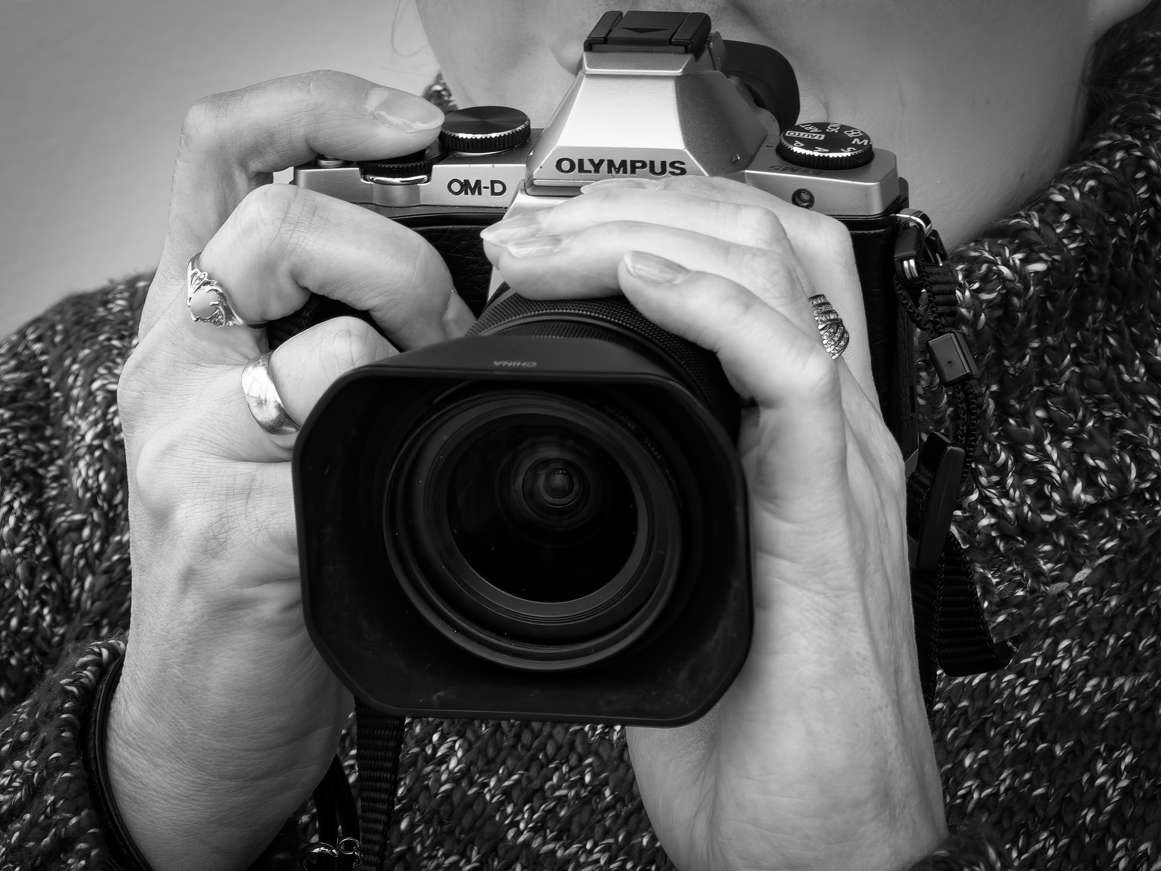 Na dobry początek splot dłoni na narzędziu, który służy każdemu fotografowi. Dłonie należą do mojej żony, a aparat to Olympus OM-D E-M5, który był moją trampoliną w skoku z lustrzanek na bezlusterkowce. Dziś zajmuje ważne miejsce na regale, obok innych historycznych aparatów.