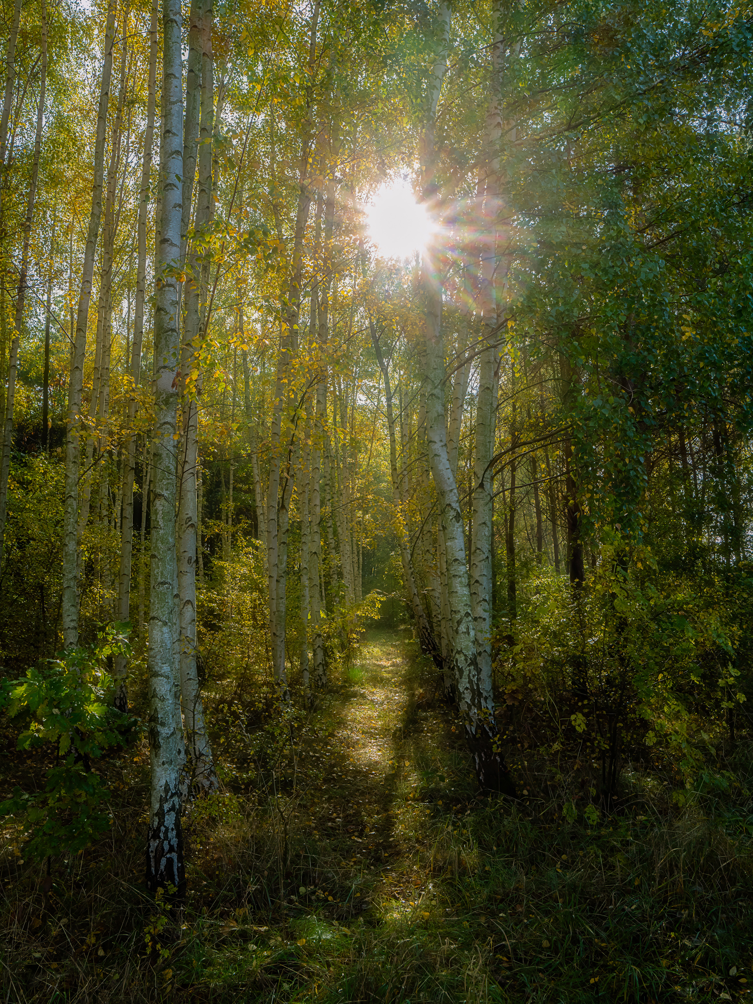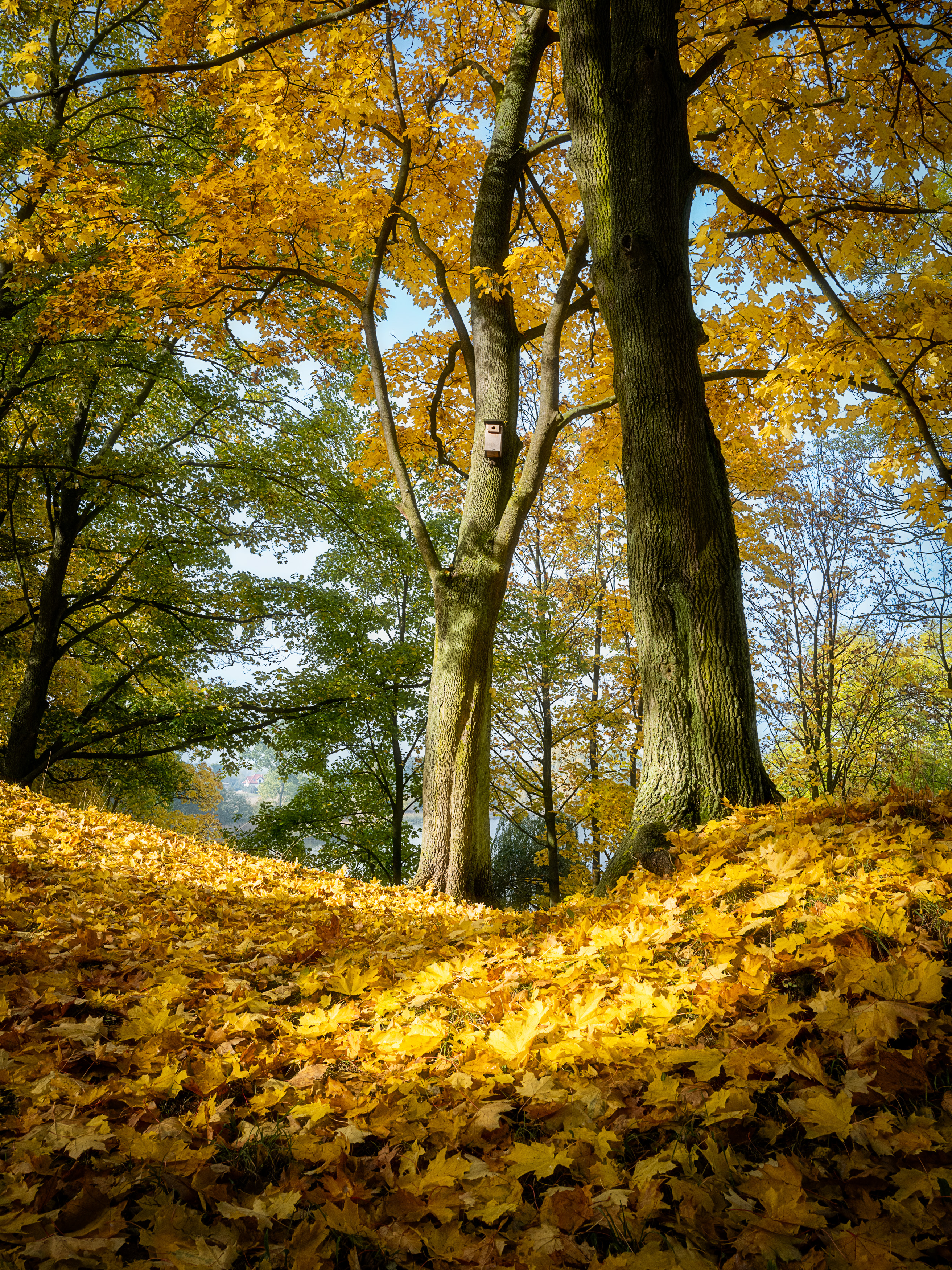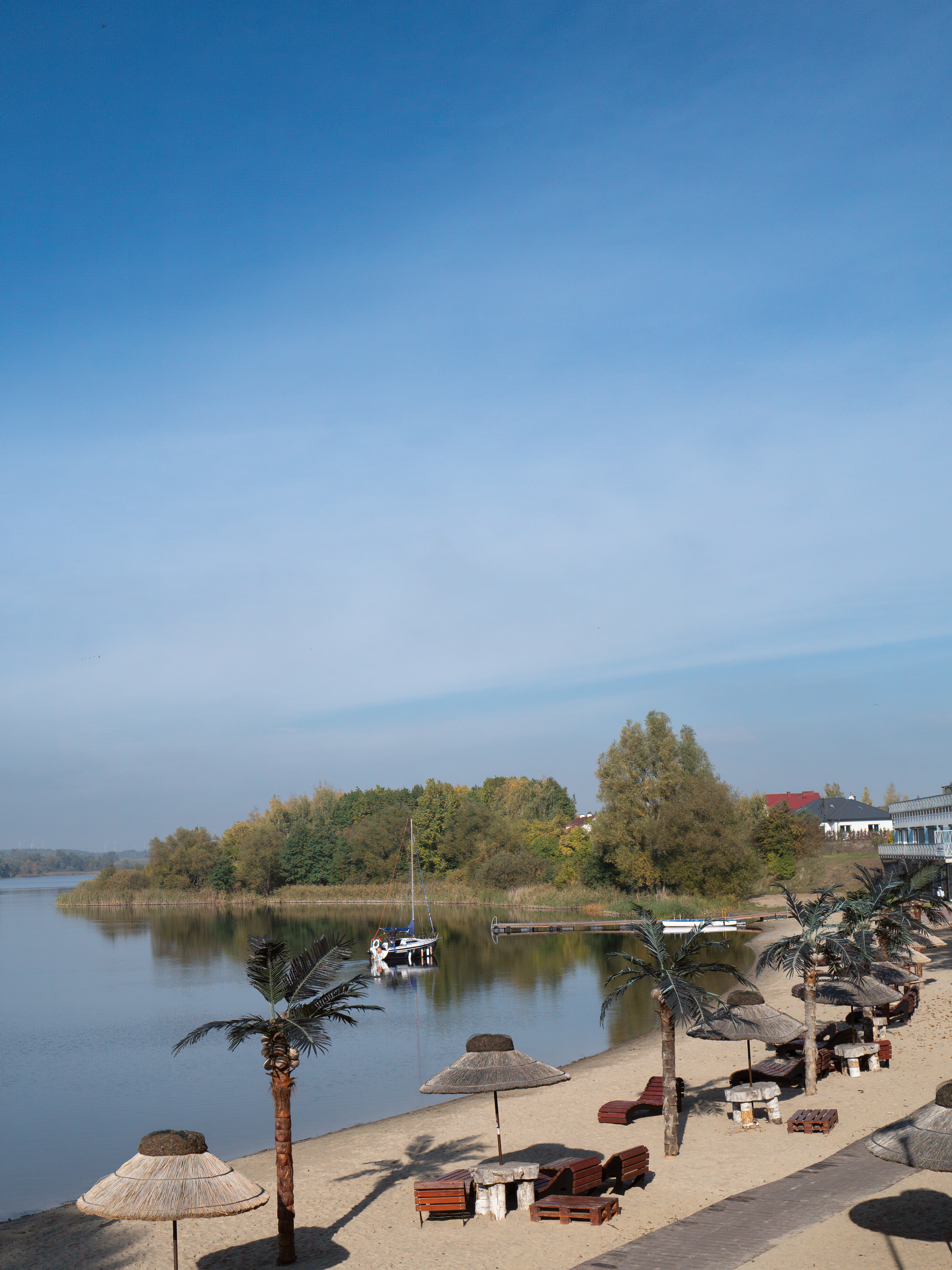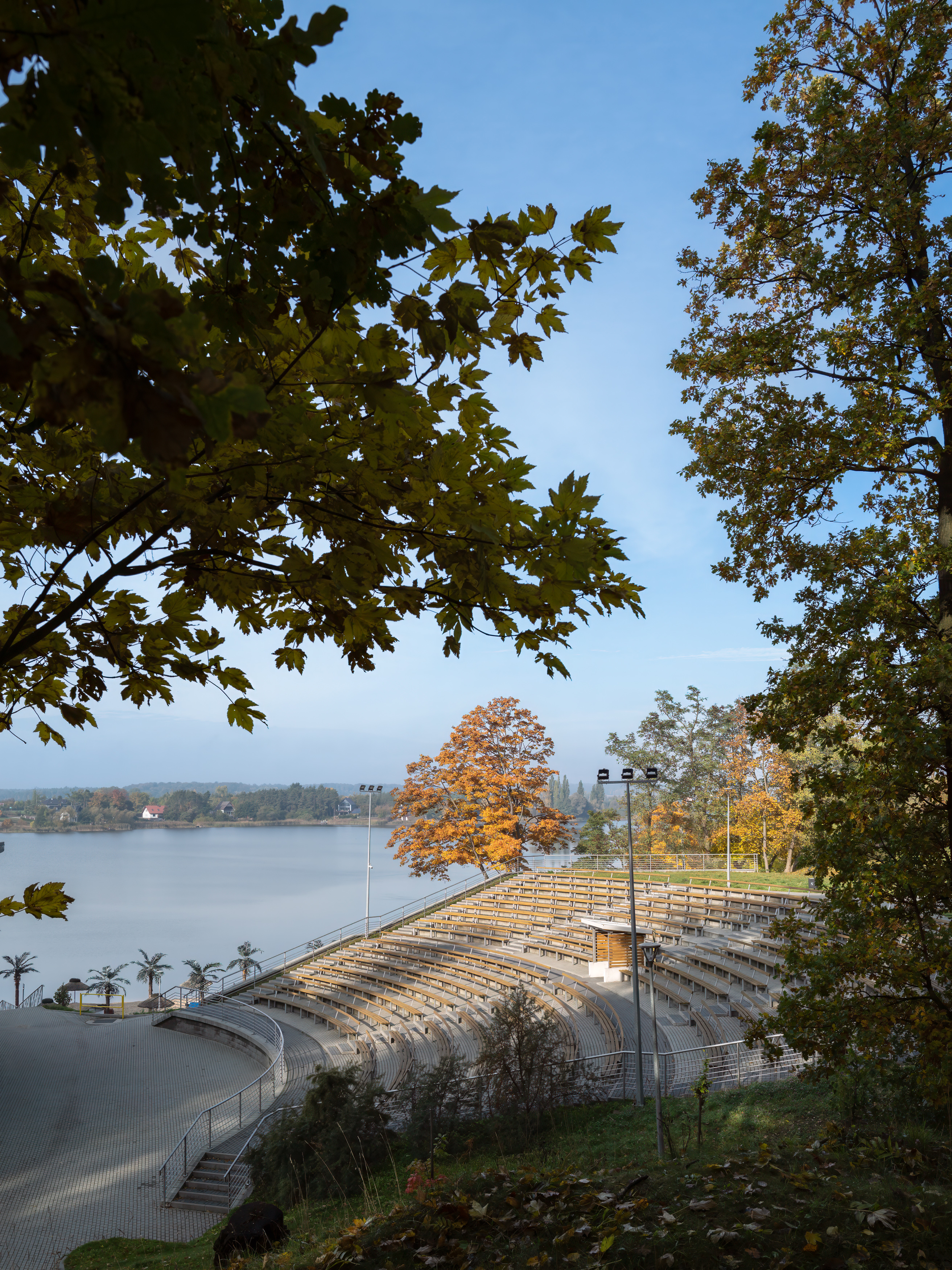 Leica Q2 jak zwykle spisała się bez zarzutów. Jest wygodna, prosta w użyciu i szybka. 47 Mp matryca zapewnia fotografie o dużej dynamice tonalnej, a Summilux 28mm to prawdziwe cudo. Jak przystało na jesienne kadry jest dużo żółci, brązu i zieleni. Kadrując chciałem pokazać niezwykłość tego miejsca, gdzie miesza się palmowy kicz z romantycznym widokiem na jezioro Zamkowe, gdzie wodny krajobraz miesza się z geometrycznymi kształtami nowoczesnego amfiteatru. No i ta alejka jesiennych brzóz, przez które przebijają się jeszcze ciepłe i delikatne, lecz bardzo ostre, promienie słoneczne. Popatrzcie…